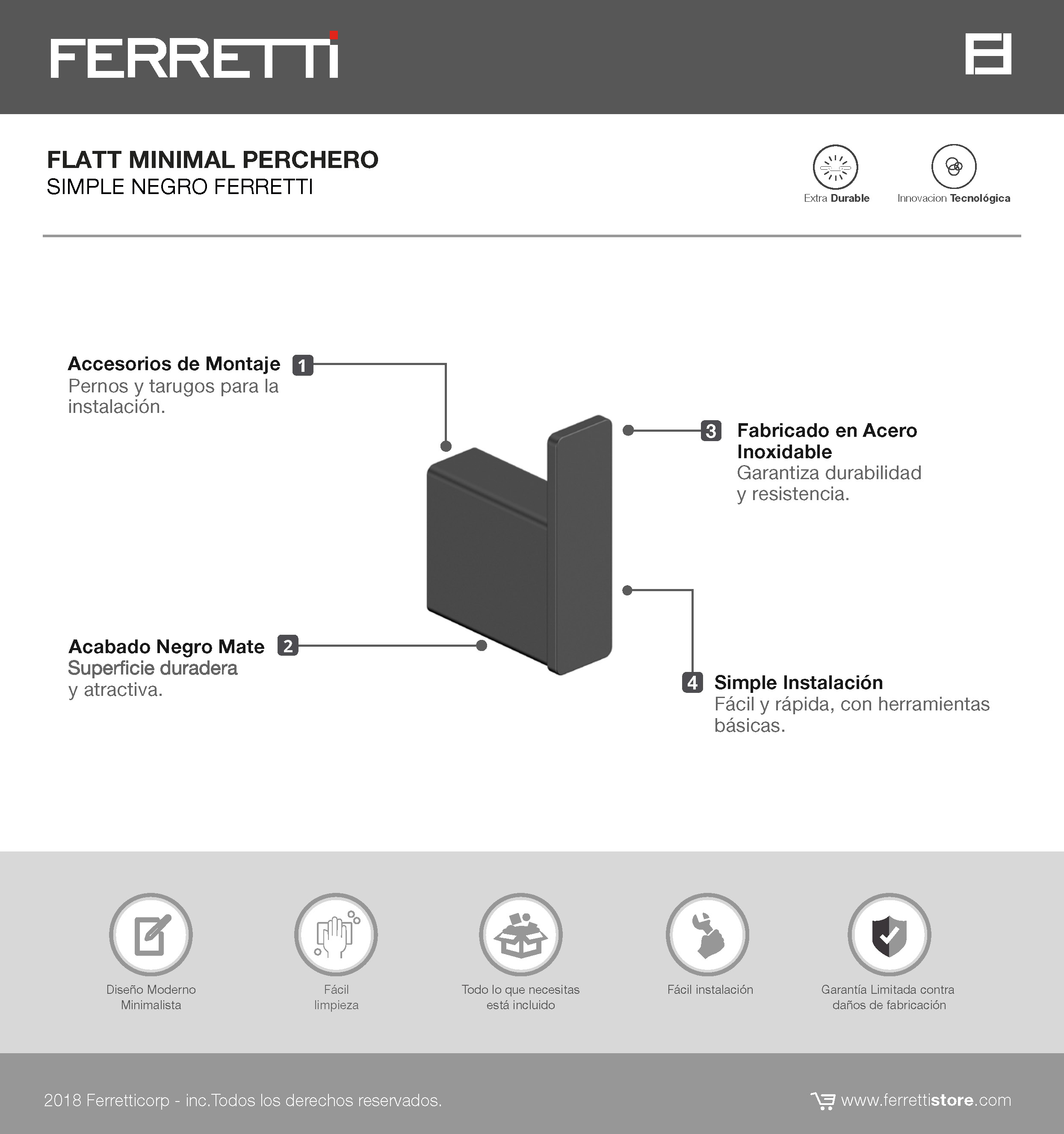 Perchero Flatt minimal simple negro Ferretti fabricado en acero inoxidable con acabado negro mate. Diseño compacto, resistente y de instalación sencilla, ideal para baños o espacios contemporáneos que buscan orden y estética limpia.