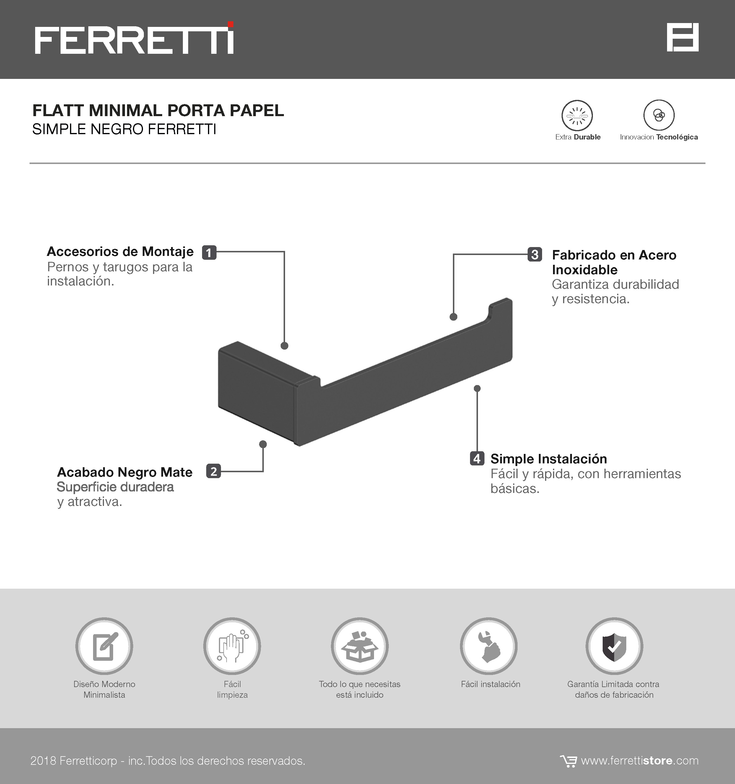 Porta papel flatt minimal negro Ferretti fabricado en acero inoxidable con acabado negro mate. Diseño moderno, resistente y de instalación sencilla, ideal para baños contemporáneos que buscan orden y estética limpia.